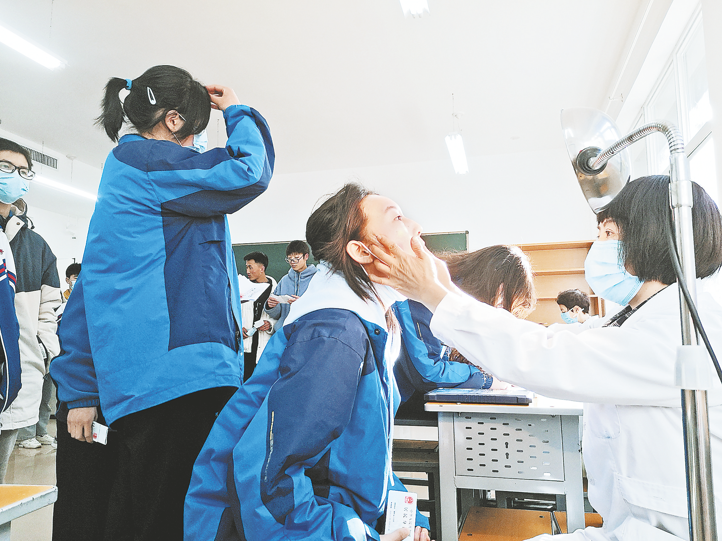 3月2日,鎮(zhèn)安中學(xué)高三學(xué)生在校園內(nèi)進(jìn)行高考體檢。由于鎮(zhèn)安中學(xué)距城區(qū)醫(yī)院較遠(yuǎn),鎮(zhèn)安縣醫(yī)院體檢中心醫(yī)務(wù)人員特意將體檢設(shè)備搬運(yùn)到學(xué)校,上門為高三學(xué)生服務(wù),節(jié)約他們的備考時間。 (楊建東 攝)