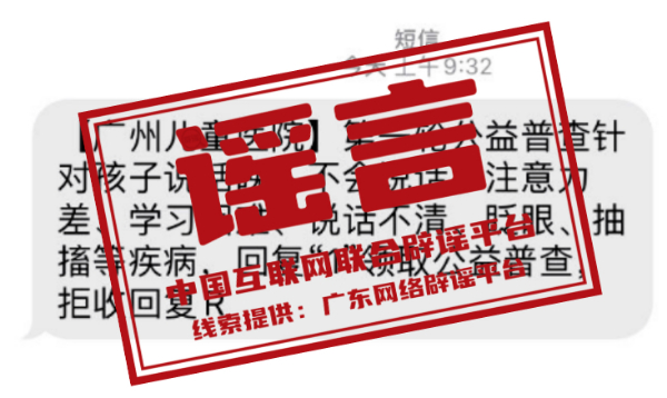 真相:近期,有社會醫(yī)療機構(gòu)冒用廣州市婦女兒童醫(yī)療中心(以下簡稱“廣州婦兒中心”)名稱,通過群發(fā)短信的方式,宣傳該中心正在進行“身高普查”“針對孩子說話晚,不會說話、注意力差等”等公益普查項目。對此,廣州婦兒中心發(fā)布聲明稱,目前,該中心未就上述公益普查項目與其他任何醫(yī)療機構(gòu)或社會組織存在合作關系,也未曾通過短信、電話向廣大患者推送過醫(yī)療信息。特此提醒廣大市民,切勿輕信此類信息,并注意保護個人隱私。(來源:廣東省互聯(lián)網(wǎng)舉報中心)