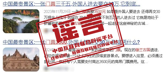 真相:近日,社交媒體平臺(tái)上流傳“新疆樓蘭故城一張門票3500元”“羅布泊門票20元”等信息,甚至有網(wǎng)民給樓蘭故城冠以“中國(guó)最貴景區(qū)”的名頭,引發(fā)關(guān)注。對(duì)此,樓蘭故城遺址所在地新疆若羌縣“若羌文旅”官方賬號(hào)辟謠稱,“樓蘭故城3500元門票”“羅布泊20元門票”的說(shuō)法都是假的。樓蘭故城從未對(duì)外開(kāi)放過(guò),廣大游客若想了解樓蘭文化,可以到若羌縣樓蘭博物館進(jìn)行了解。此外,羅布泊是無(wú)人區(qū),禁止非法穿越。(來(lái)源:“新疆網(wǎng)絡(luò)辟謠”微信公眾號(hào))