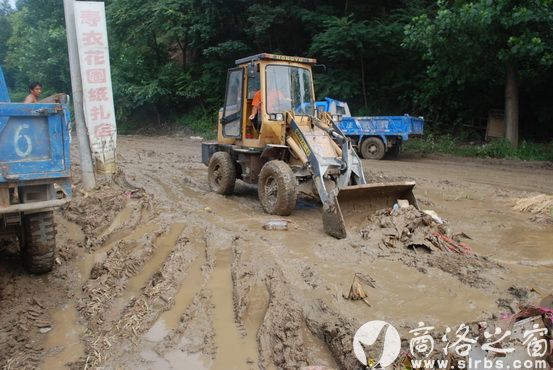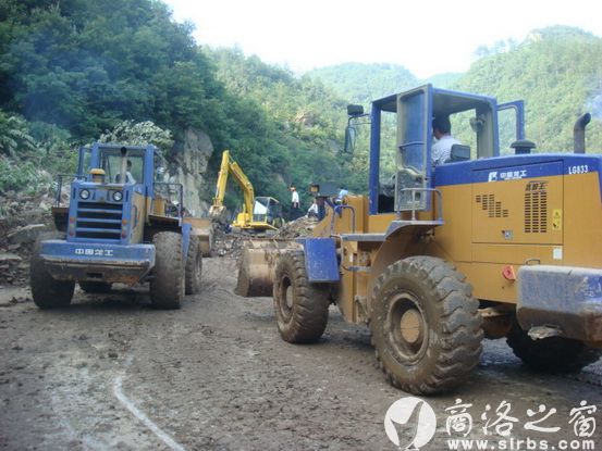 大批機(jī)械在中斷的商鄖路進(jìn)行搶修