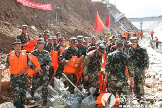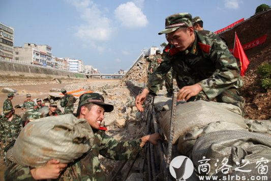 本網(wǎng)訊(陳紅衛(wèi) 攝影報道) 滄海橫流,方顯英雄本色。在山陽縣河毀堤現(xiàn)場,有這樣一群鐵打的軍人,為搶修河堤揮汗如雨。