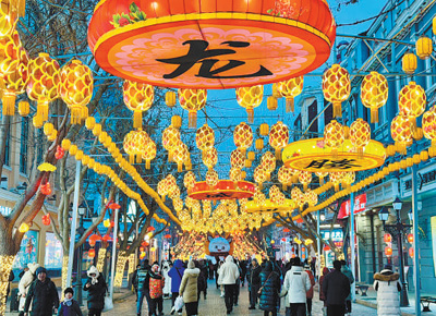 2月9日,游客在喜慶熱鬧的黑龍江哈爾濱市中央大街游玩。