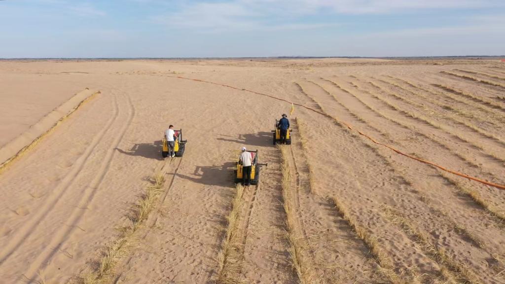 “過去我們不知道什么樣的機械適合在沙漠腹地運行,扎草方格和種苗一直依靠人工,效率很低。”杜永軍說,烏拉特后旗沙化土地面積2065萬余畝,已經治理的面積僅有459萬余畝,剩余治理任務重、難度大,很多地方連路都沒有,光靠人工背著草和樹進去,耗時太長,“‘人海戰(zhàn)術’已經難以滿足新時代防沙治沙需求”。