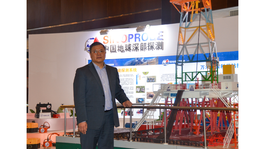■黃大年在2013年中國地球深部探測項目年會上的照片,身旁是他率領(lǐng)團(tuán)隊研發(fā)的“地殼一號”萬米大陸科學(xué)鉆探機(jī)的展示模型(2013年4月18日攝)。新華社發(fā)