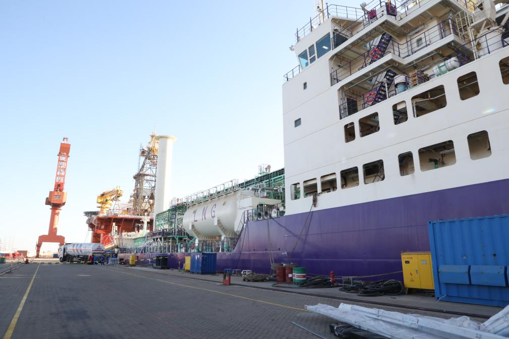 1月2日,大連船舶海洋工程有限公司廠區(qū)內(nèi)碼頭上,一輛LNG運輸卡車正在為“北極探路者”運輸船進行保稅LNG燃料加注。