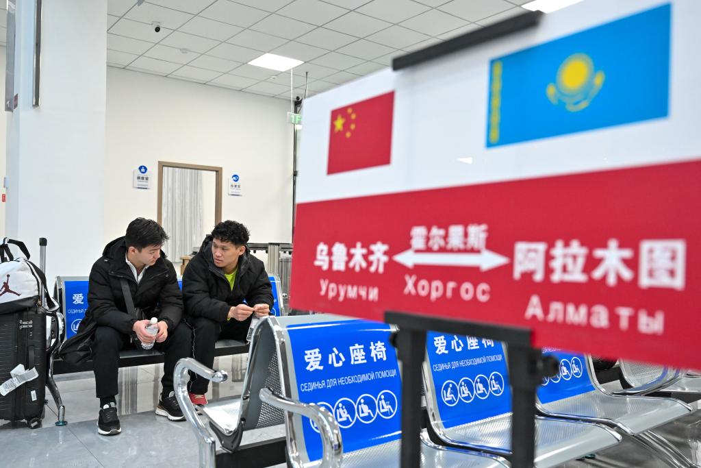 1月8日,在烏魯木齊陸港國際客運站,伊利亞索夫·安瓦爾(左)和同學在候車廳等候前往阿拉木圖的國際班車。新華社記者丁磊 攝