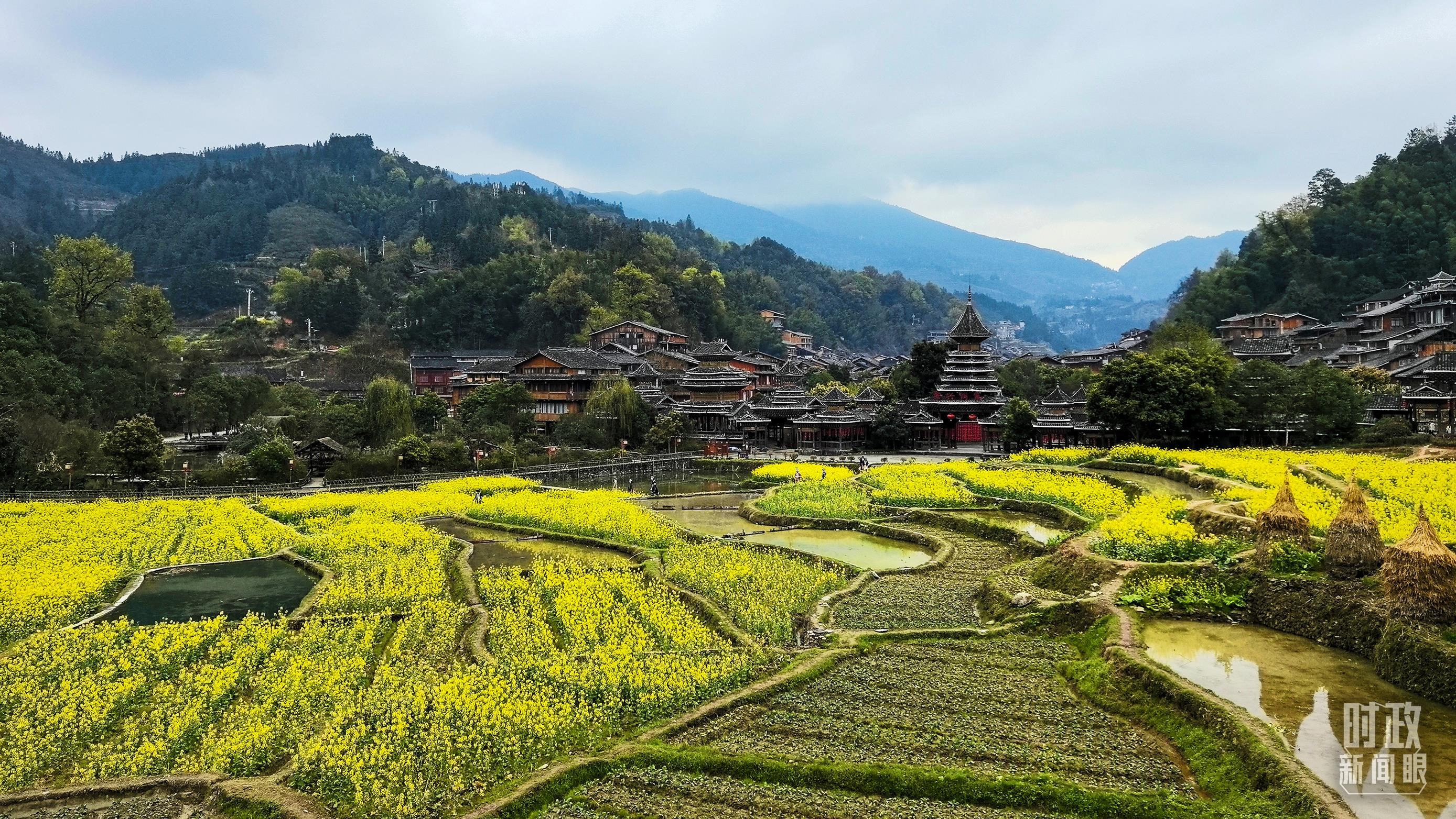 △春日的肇興侗寨,油菜花競(jìng)相綻放。(總臺(tái)央視記者程鋮拍攝)