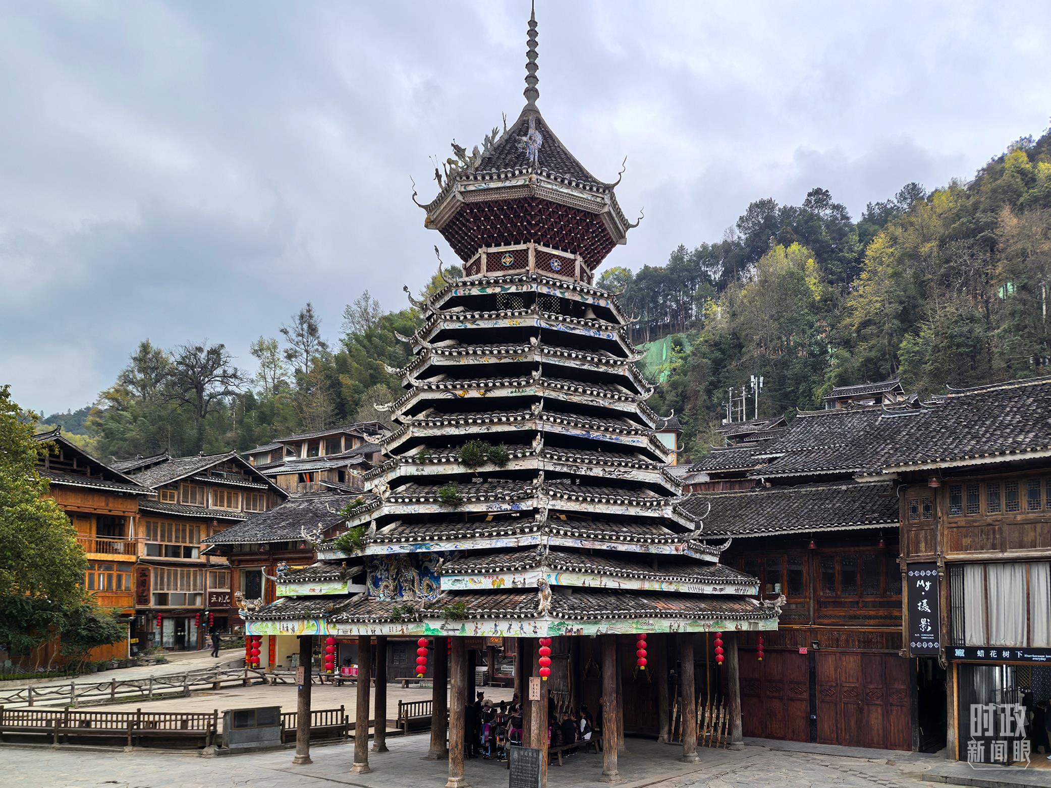 △肇興侗寨以鼓樓群最為著名,五座鼓樓分別取名“仁團(tuán)鼓樓”“義團(tuán)鼓樓”“禮團(tuán)鼓樓”“智團(tuán)鼓樓”“信團(tuán)鼓樓”。圖中為信團(tuán)鼓樓。(總臺(tái)央視記者陸泓宇拍攝)