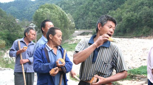 水毀修復(fù)工地的農(nóng)民工兄弟品嘗著鄉(xiāng)干部送來(lái)的月餅