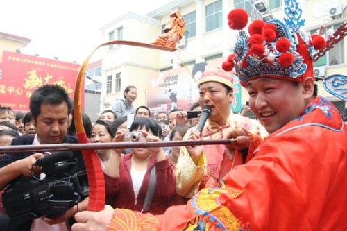 在婚禮儀式上,新郎首先用弓箭向天地各射一箭,后一箭射向新娘,代表“一心一意”,然后請(qǐng)新娘下轎,共同跨過火盆,新郎再用秤桿挑起新娘的蓋頭。這種奇特的結(jié)婚儀式引來(lái)千余群眾駐足觀看。