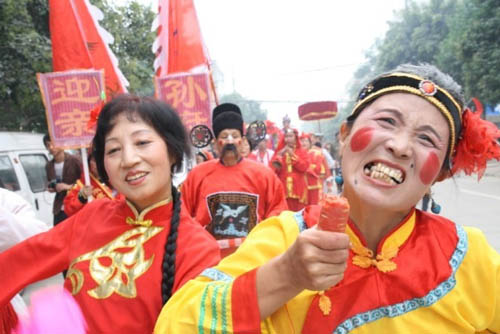 縣官鳴鑼開道,秧歌隊(duì)緊跟其后邊走邊跳,小丑幽默滑稽的動(dòng)作不時(shí)逗的觀眾哈哈大笑。新郎騎著大紅馬,戴著大紅花,身穿狀元袍,不時(shí)抱雙拳向圍觀群眾作揖。新娘頭戴鳳冠霞帔,坐在八抬大轎上。