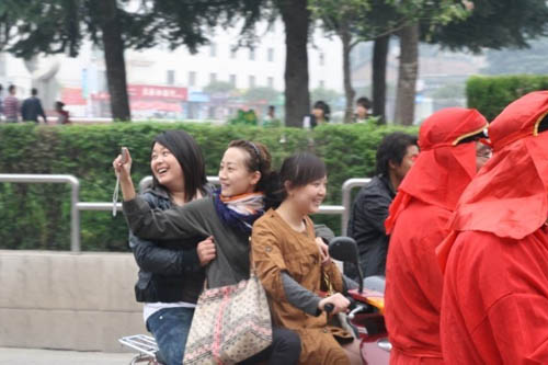迎親隊(duì)伍從商洛學(xué)院門口出發(fā),到東街新娘家,再到天元大酒店門口舉行儀式,一路上熱鬧非凡,引得不少群眾緊跟其后看熱鬧,路人不時(shí)拿出手機(jī)照相留念,連過路的公交車也停下來(lái)觀看。
