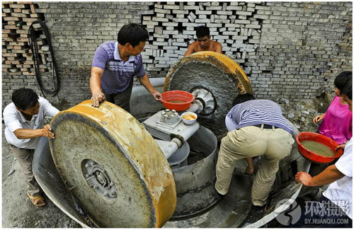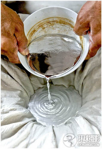 把磨子底部的“汞金”收集后倒入多層棉布中過濾,用四層棉布過濾“汞金”