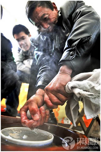 有經(jīng)驗的淘金師傅正在過濾把從河道里篩出的砂金,這個關(guān)鍵工序一般是老板的“自己人”來操作