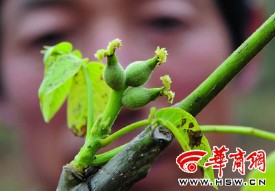 對此,商洛市核桃研究所高級工程師王根憲解釋說,開花的核桃樹屬于新疆的矮化品種,有著二次開花的傳統(tǒng),但不能正常結果。之所以前些年在商洛地區(qū)沒有出現(xiàn)過這種現(xiàn)象,是因為氣候條件不具備,今秋屈建章家種的核桃樹開花掛果了,與國慶節(jié)期間的氣候回暖和地理位置有關。記者李杰攝影報道