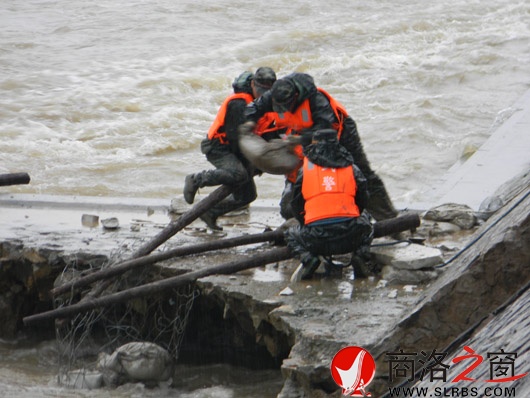 13日一大早,兩岸何堤危險(xiǎn)處被拉起了警戒線,武警官兵出現(xiàn)在了搶險(xiǎn)第一線。由于水流湍急,只能采用鐵絲籠裝沙袋填埋沉陷處和被淘空基石的措施防止洪水進(jìn)一步肆虐。武警官兵們緊張地裝沙袋,再將沙袋裝進(jìn)鐵絲籠中,裝載機(jī)將裝好沙袋的鐵絲籠拋入沉陷坑內(nèi)。由于基石下被水淘蝕,裝載機(jī)不能準(zhǔn)確地將沙袋放入,所以武警官兵必須下去站在僅剩的基石上將沙袋放進(jìn)被淘空處。洪水咆哮,大雨無(wú)情。河堤上的人為站在基石上的武警官兵捏著一把汗,岸上的武警戰(zhàn)士小心地將沙袋沿著斜坡滾到基石上,下面的官兵迅速將沙袋裝入放在洪水中的鐵絲網(wǎng)內(nèi)。由于水流沖擊力大,武警戰(zhàn)士不得不用撬杠張開鐵絲籠口,沉重的沙袋在肆虐的洪水中如困獸般與武警戰(zhàn)士較量著,兩名戰(zhàn)士不得不壓低身體,幾乎是趴在撬杠上奮力地張著鐵絲網(wǎng)。