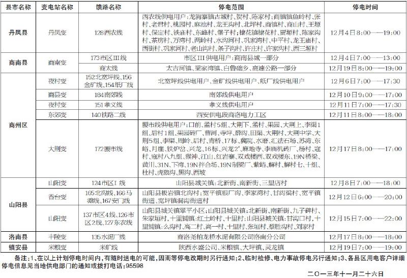商洛供電局2013年12月計(jì)劃檢修停電范圍