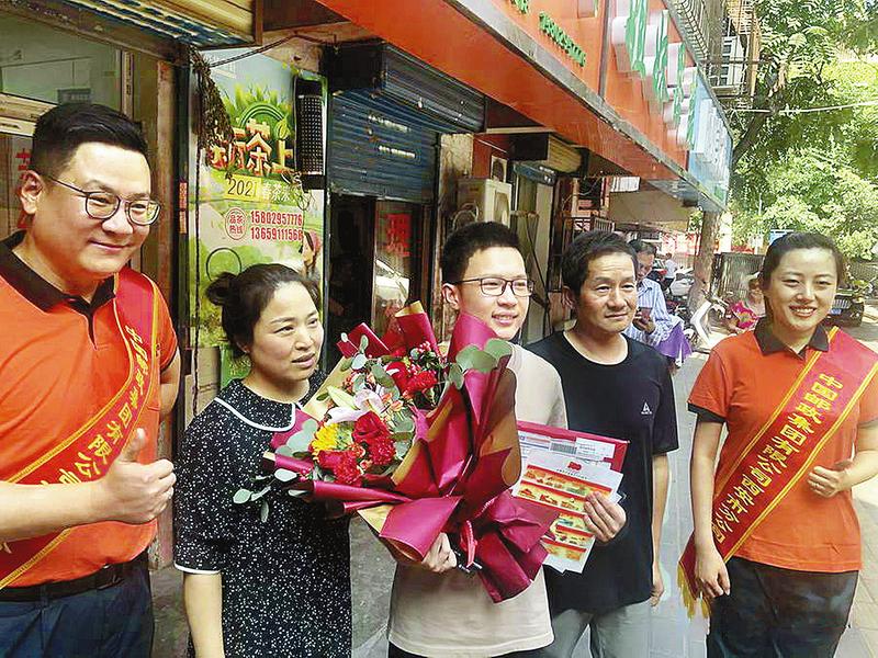 7月7日,閔政皓(中)和他的父母收到高考錄取通知書時與郵政人員合影