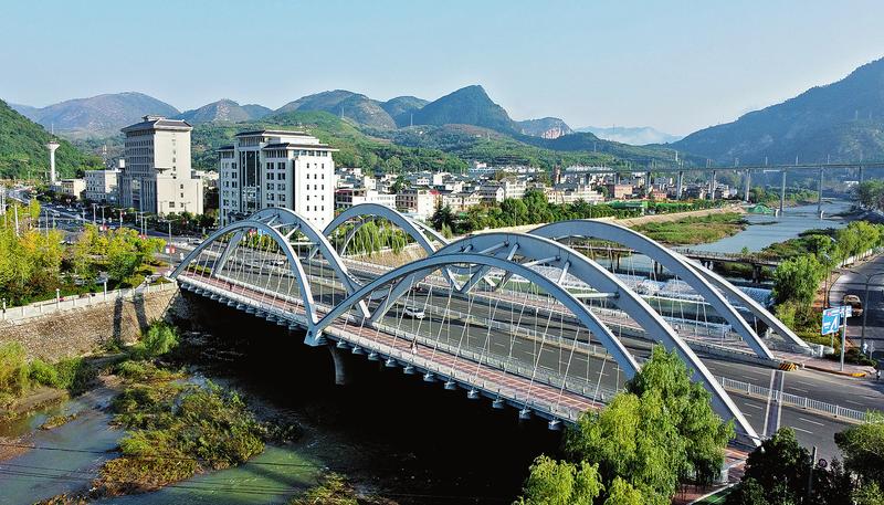 丹江構(gòu)峪大橋位于商洛市西門戶區(qū),宏偉的橋身橫跨丹江兩岸,現(xiàn)代、大氣,造型優(yōu)美,雙向6車道,是商洛地標性景觀大橋。該橋由上海同濟大學設(shè)計,于2018年10月建成通車。每到夜晚,橋體燈光絢麗,流光溢彩,不僅提升了城市品位,更彰顯了城市魅力。(記者 楊森 攝)