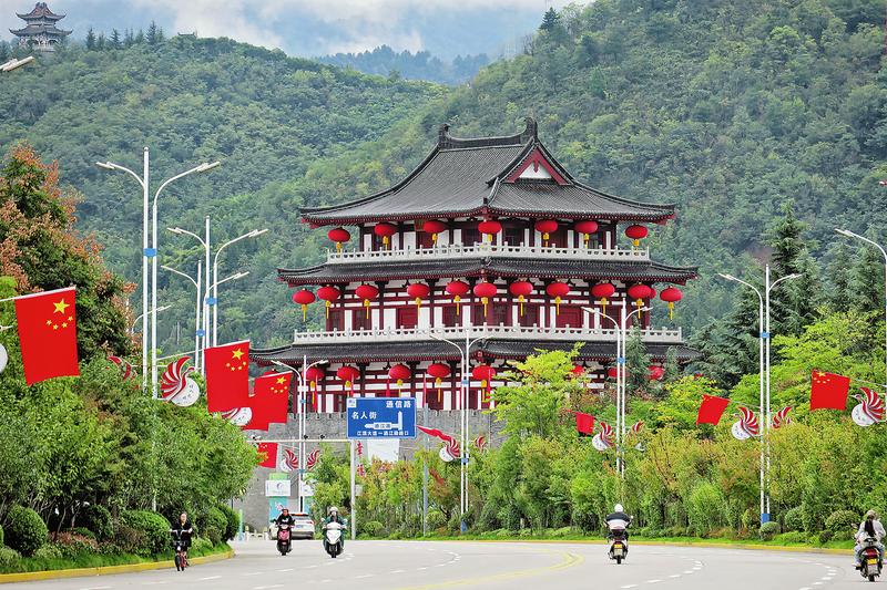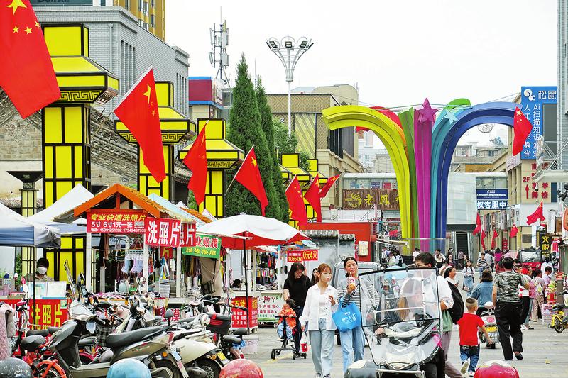 國慶節(jié)期間,市區(qū)五星紅旗迎風(fēng)飄揚。