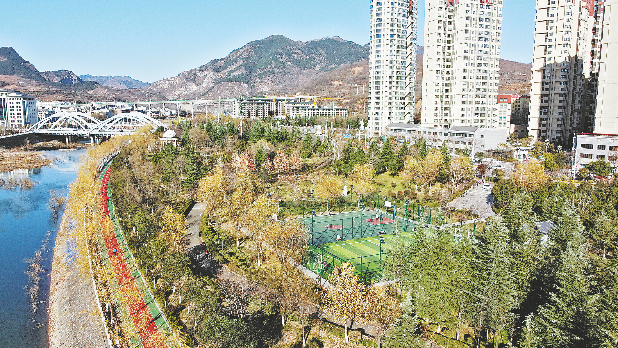 我市在丹江公園內(nèi)建有籃球場、乒乓球場等多個運動場,它集生態(tài)功能、運動功能于一體,是開放式全民健身場所。它賦予了公園新的內(nèi)涵,融生態(tài)、全民健身和智慧理念為一體,使得丹江公園綜合性功能發(fā)揮到最大,真正成為全民可參與的綠色體育公園。圖為位于丹江公園西部、毗鄰構(gòu)峪大橋的運動場,里面設備齊全、環(huán)境優(yōu)越,周圍景色宜人。