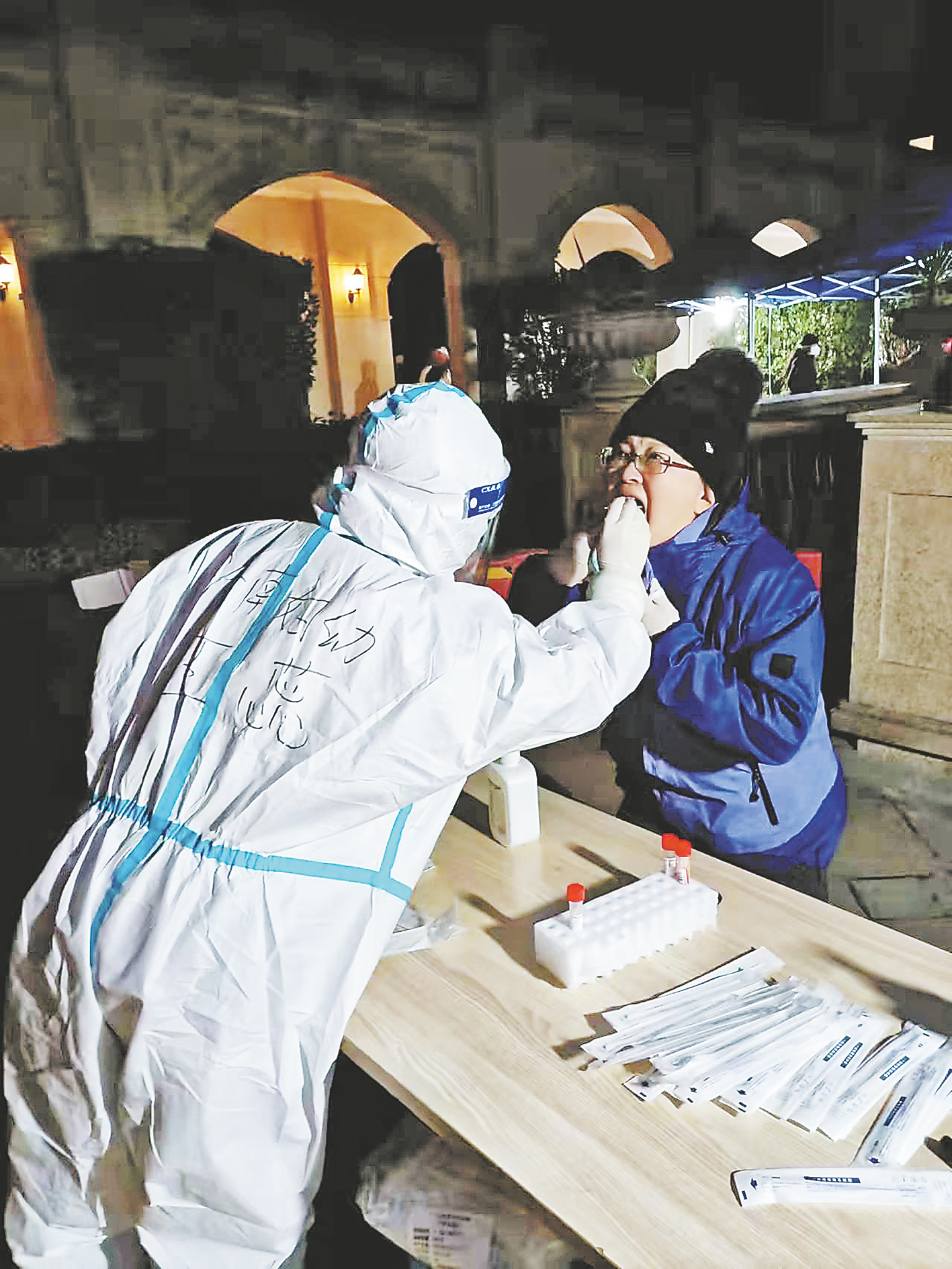 據(jù)李紅英介紹,25日下午到達(dá)酒店的時(shí)候,門口就設(shè)立了采集點(diǎn),他們坐在車上就能看到群眾冒雪做核酸排的長(zhǎng)隊(duì)。現(xiàn)場(chǎng)還有很多志愿者和工作人員在維護(hù)秩序,提醒大家戴好口罩,保持有效距離,按序開展采集。“我們那時(shí)候就很著急,看著那么長(zhǎng)的隊(duì)伍,恨不得當(dāng)時(shí)立即下車就到檢測(cè)臺(tái)上開始工作。”李紅英感慨地說,“以前經(jīng)常來西安,感覺一派盛世繁榮的景象,車輛川流不息,而這次來西安,車輛所經(jīng)之處,一片空曠、寂靜,感覺心里很沉重。我們常說大美西安,我們商洛作為西安的后花園,感覺就是一體的。現(xiàn)在就希望西安疫情早點(diǎn)結(jié)束。”