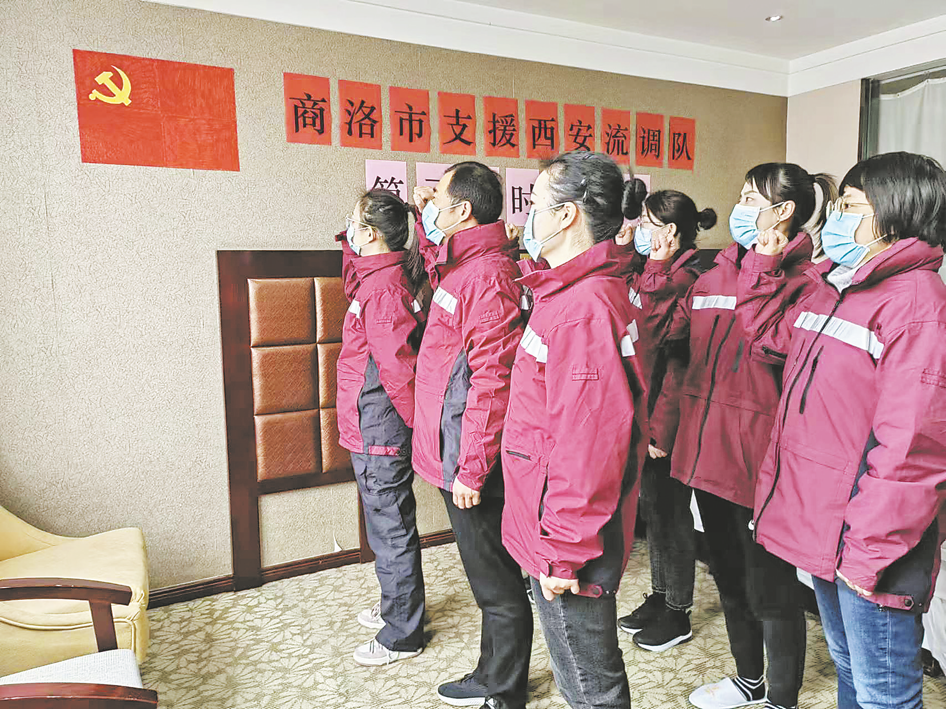 寇亞斌介紹,他們這批隊(duì)員由市衛(wèi)生健康執(zhí)法支隊(duì)、市疾控中心、商州區(qū)疾控中心、洛南縣疾控中心以及3家市級(jí)醫(yī)院的20名人員組成,隊(duì)伍中有9名黨員和1名預(yù)備黨員。由于大家來自不同單位、不同行業(yè)、不同專業(yè),急需一個(gè)強(qiáng)有力的組織把大家快速地凝聚在一起。在到達(dá)的當(dāng)晚,他們隨即召開黨員會(huì)議討論,決定成立臨時(shí)黨支部。經(jīng)市疾控中心黨總支研究批復(fù),批準(zhǔn)成立商洛市支援西安流調(diào)隊(duì)第三臨時(shí)黨支部。在狹小的工作空間里,大家用手繪制出一面黨旗,并莊嚴(yán)宣誓:在疫情防控面前,將一往無前、絕不退縮,用擔(dān)當(dāng)承載責(zé)任,用行動(dòng)踐守誓言,讓黨旗在抗疫前線高高飄揚(yáng)。