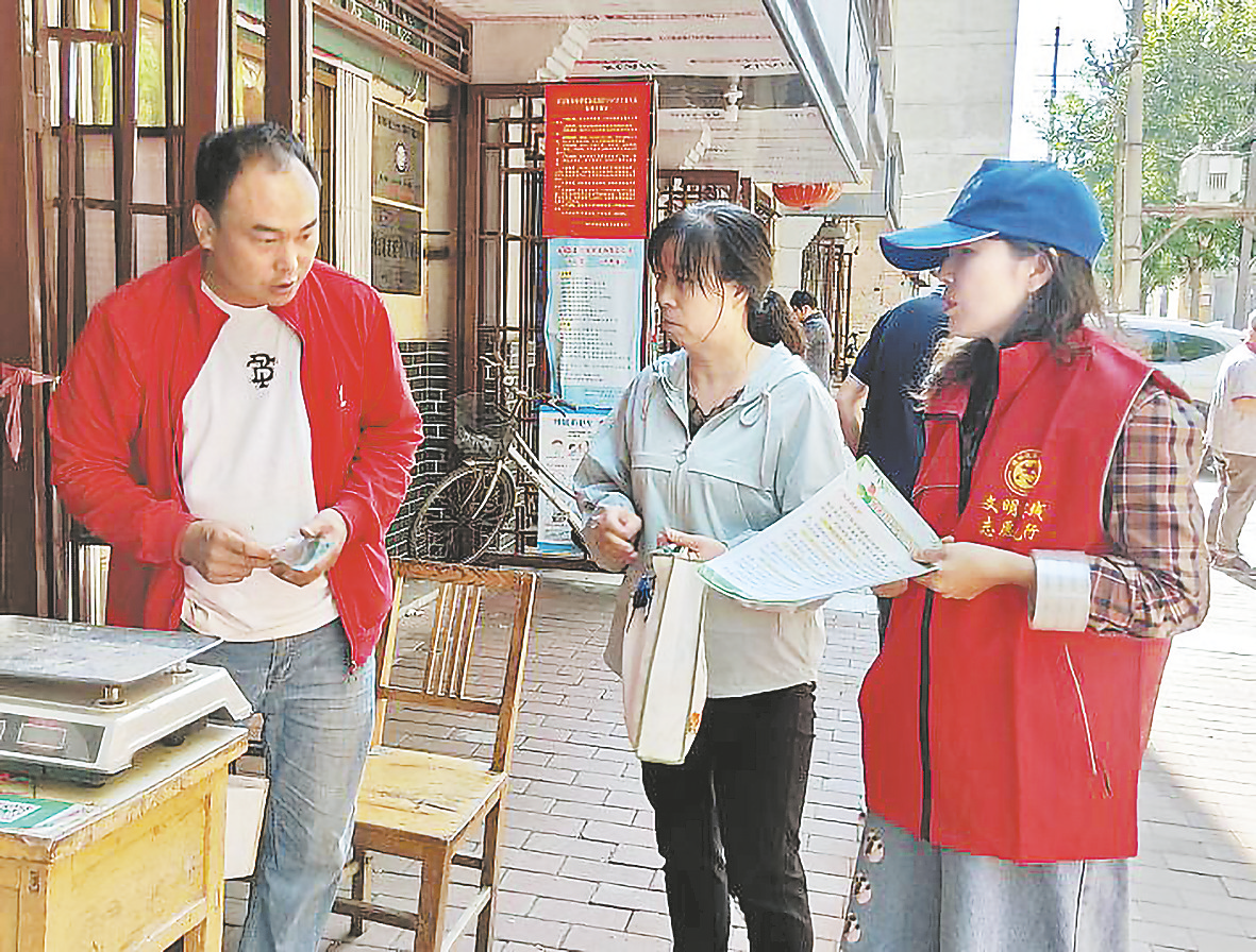 志愿者進社區(qū)、進商店開展垃圾分類宣傳活動。