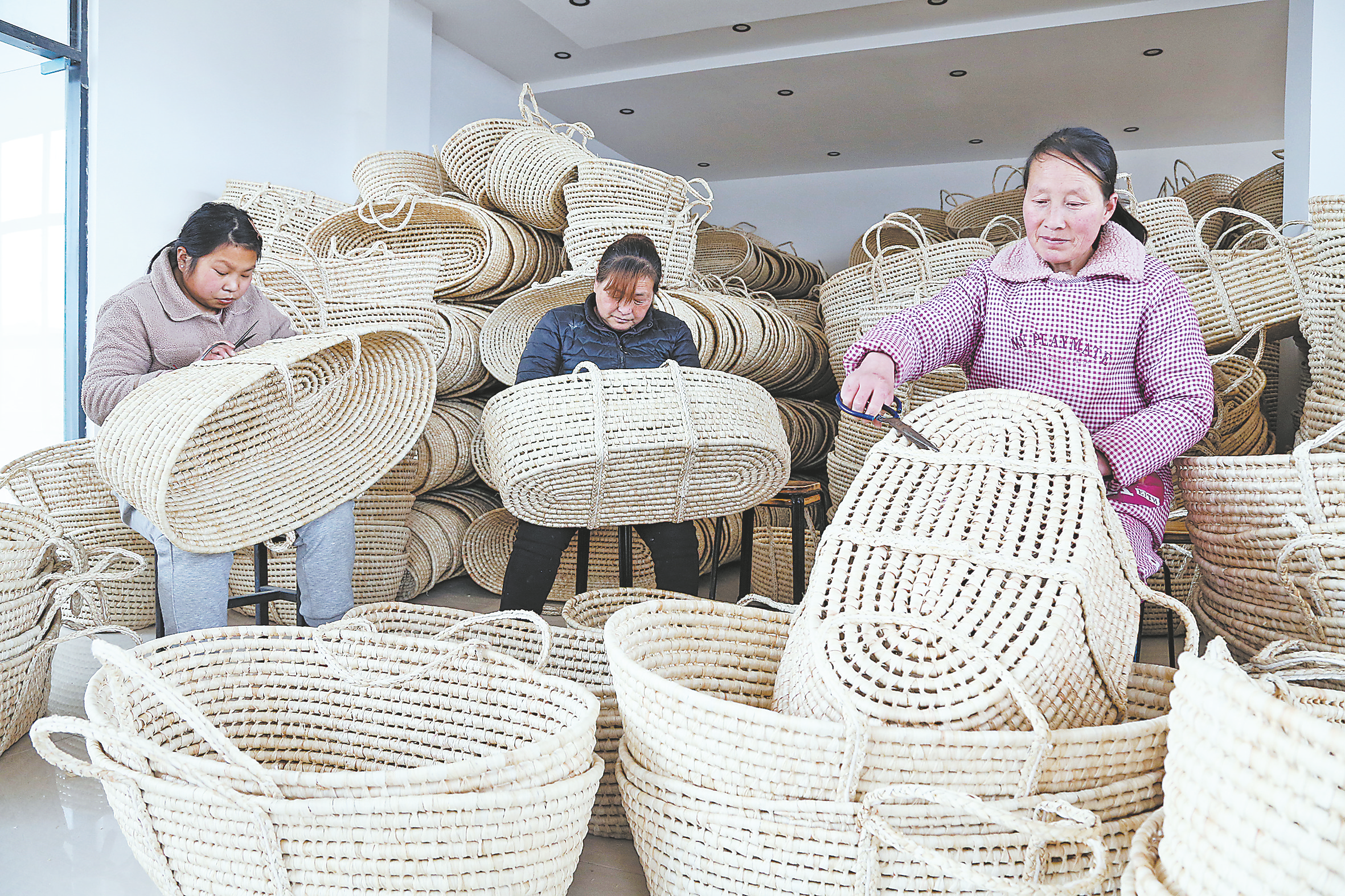 ?、芎芏噢r村婦女在料理家務和照看老人、孩子的同時,她們會利用閑余時間找點活干,撐起家庭的經(jīng)濟重擔。洛南縣景村鎮(zhèn)豐中村村民李彩霞在當?shù)氐牟菥幒献魃缟习?,她?0多名婦女一起,每天利用玉米和小麥秸稈等編織搖籃、帽子、拖鞋等產品,由于產品純手工且環(huán)保無污染,市場前景廣闊。她們在增加家庭收入的同時,也將傳統(tǒng)手工藝產品推向了國內外市場。