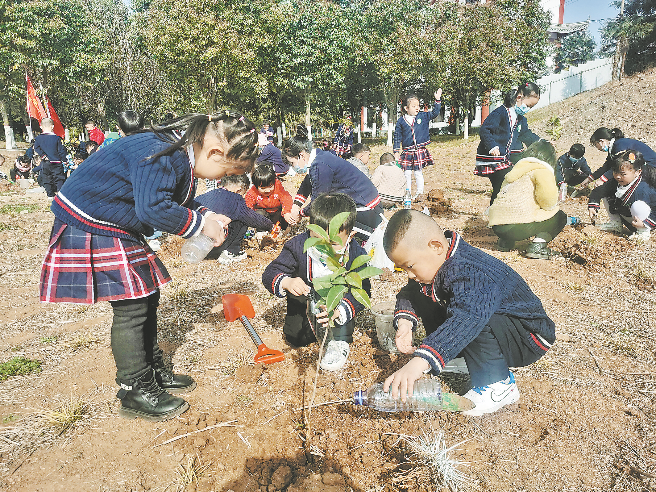 △3月9日,商州區(qū)第二幼兒園組織中班師生開(kāi)展“守護(hù)綠色、共添春意”主題植樹(shù)活動(dòng)。孩子們爭(zhēng)相填土、澆水,在體驗(yàn)勞動(dòng)樂(lè)趣的同時(shí),對(duì)愛(ài)護(hù)花草樹(shù)木、保護(hù)環(huán)境有了新的認(rèn)識(shí)。 (記者 王 倩 攝)