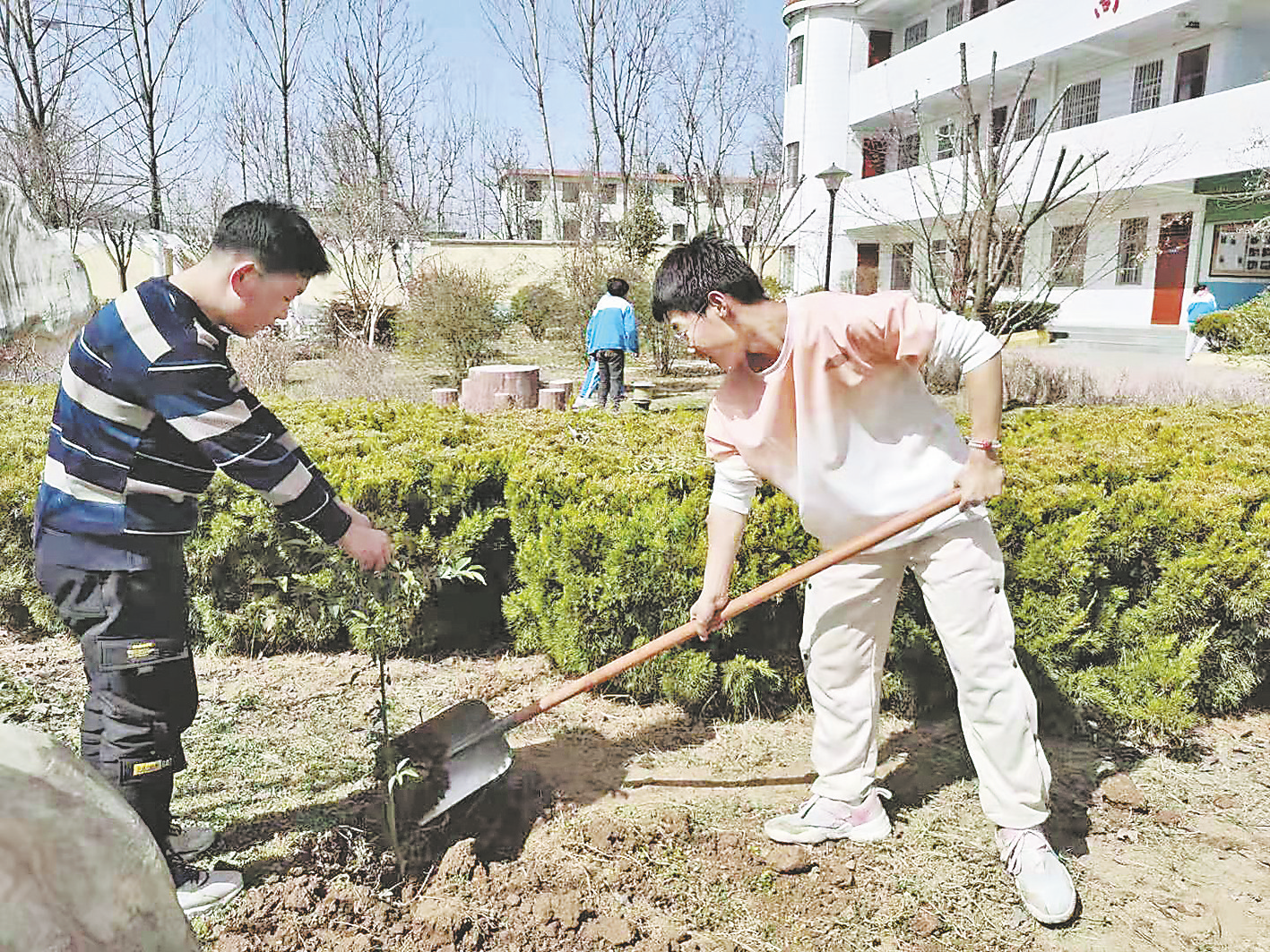 ?3月8日,洛南縣眉底中學(xué)團(tuán)委組織了以“擁抱春天、播種綠色”為主題的植樹(shù)活動(dòng),全校師生200多人對(duì)校園中的苗木進(jìn)行澆灌、松土、清除雜草,對(duì)干枯苗木進(jìn)行了清理和移栽。(楊開(kāi)讓 攝)