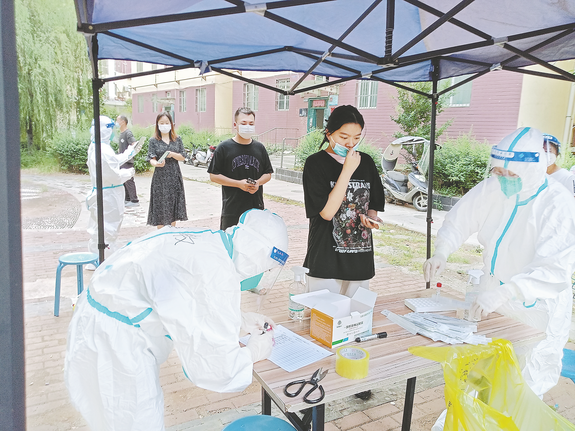 志愿者崔敏(左)協(xié)助醫(yī)務(wù)人員開展核酸檢測(cè)