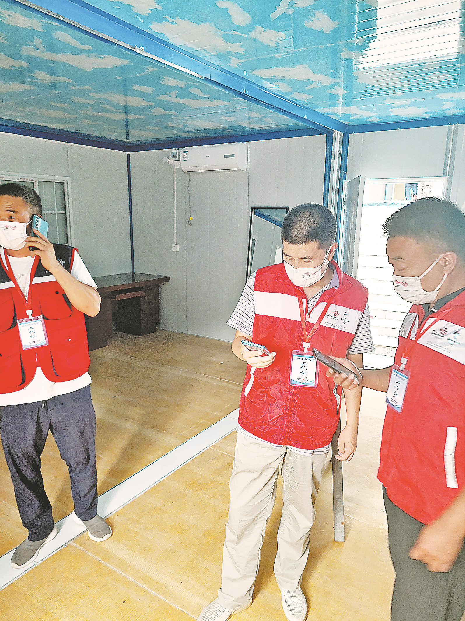 商州黨支部黨員帖英杰,入黨積極分子孫英德、白亮和其他幾位同事一起,已經(jīng)在單位住了10天,積極參與隔離點門磁、攝像頭安裝工作,每天工作到凌晨三四點,實在太累了就躺在地上休息一下,在疫情形勢較嚴(yán)峻的幾天,都是天亮?xí)r才拖著疲憊的身軀回到公司,稍作休息后又趕赴下一個隔離點。