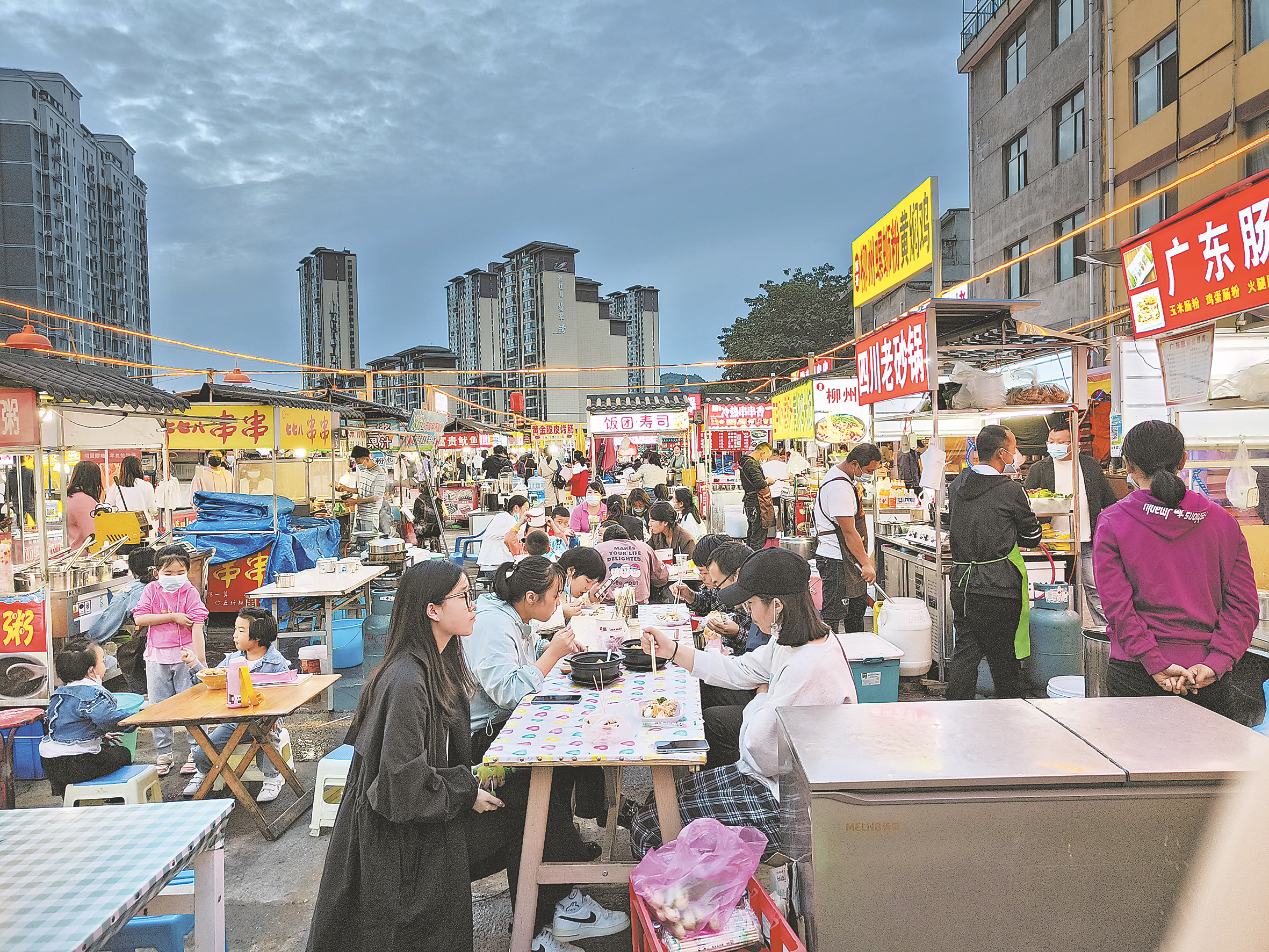 自9月25日起,商州夜市在實(shí)行錯(cuò)峰限流、查驗(yàn)“雙碼”、清潔消毒等各項(xiàng)防控措施下有序逐步恢復(fù)營(yíng)業(yè)。圖為9月27日,位于民居路的商州夜市內(nèi),市民在攤位前享受美食。(本報(bào)見習(xí)記者 程思凡 攝)