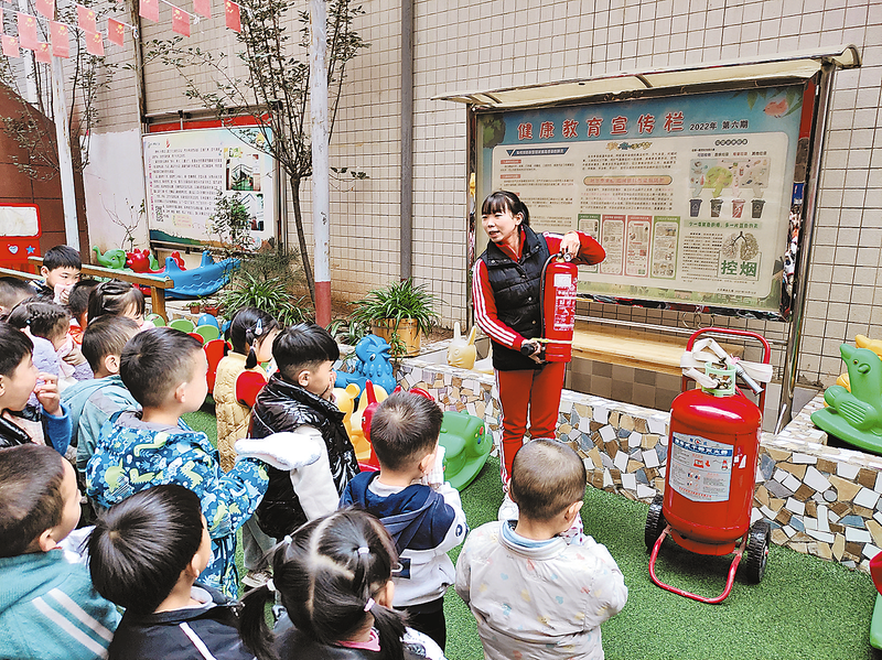 11月9日,市區(qū)部分幼兒園組織師生在園內(nèi)開展消防安全教育活動,向幼兒普及消防安全知識,增強自我保護意識。 (本報記者 方 方 攝)