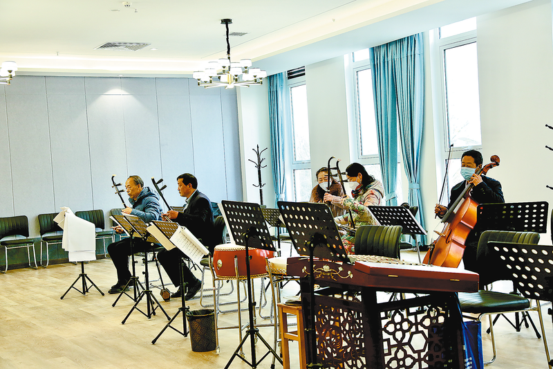 在金山康養(yǎng)城休閑娛樂(lè)中心,老人們自發(fā)組織樂(lè)團(tuán)排練樂(lè)曲。