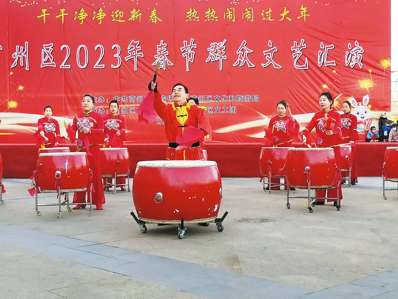 1月29日,在市區(qū)西街大都匯廣場,商州風(fēng)威鑼鼓隊為市民獻上歡慶鑼鼓鬧新春節(jié)目,吸引了眾多群眾觀看,為新年營造了熱熱鬧鬧的氛圍。 (本報記者 賈書章 攝)