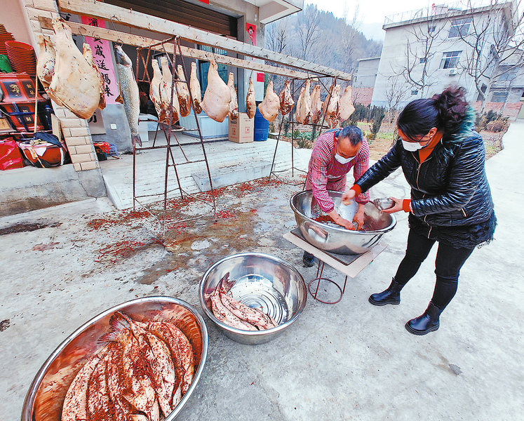 張全東介紹,春節(jié)前他家露臺上、院子里到處掛滿臘肉,有熏制的、有自然風(fēng)干的,有麻辣的、有五香的,做法不同,口感風(fēng)味也不一樣,傳統(tǒng)的農(nóng)家臘肉已經(jīng)被他開發(fā)成了不同的特色產(chǎn)品。春節(jié)前后,臘肉成為供不應(yīng)求的特色年貨,最多的時候一天他要向西安運送3貨車的臘味,價值20多萬元。