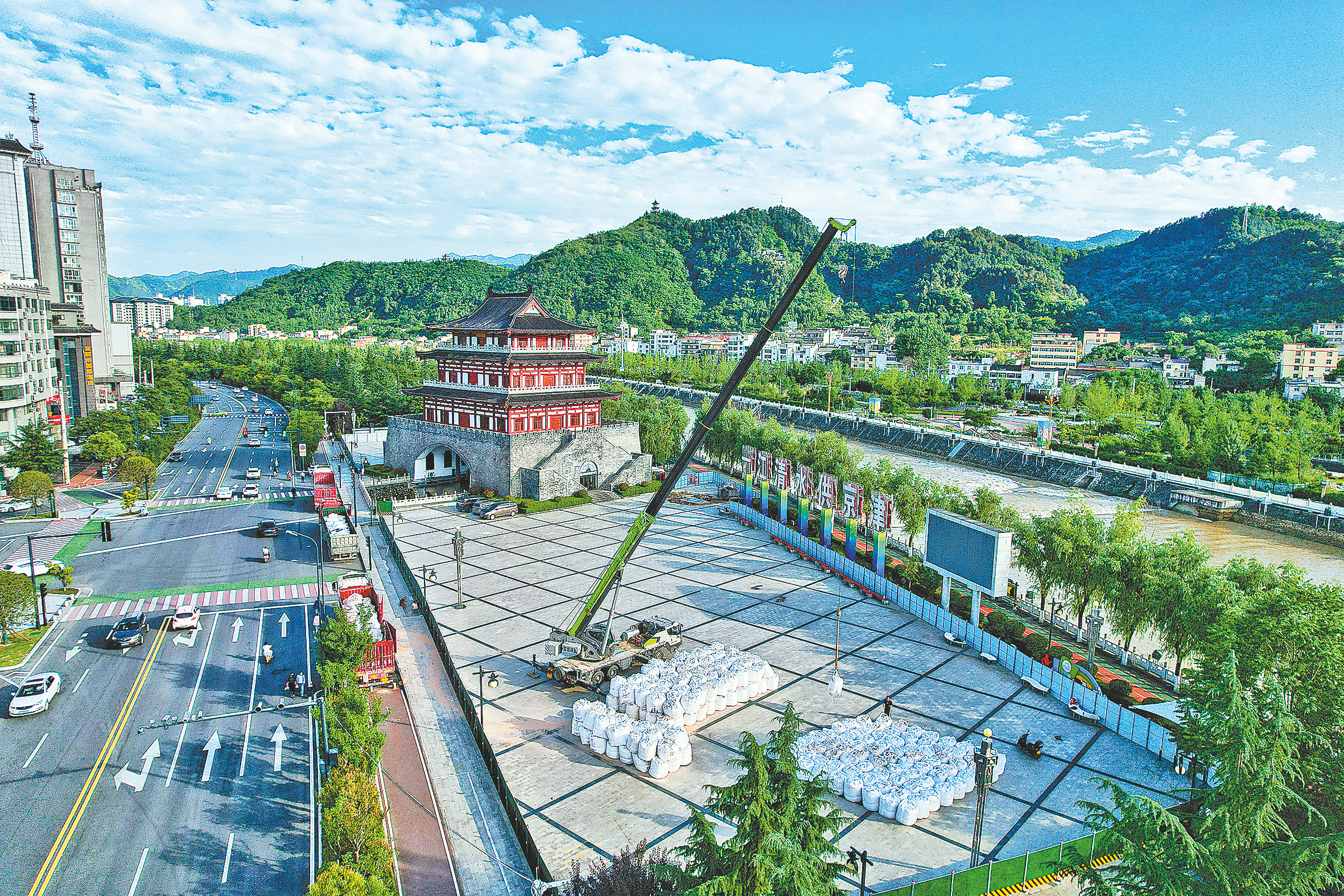 由國(guó)家體育總局排球運(yùn)動(dòng)管理中心、中國(guó)排球協(xié)會(huì)主辦,市體育局、商州區(qū)人民政府承辦的“2023全國(guó)沙灘排球錦標(biāo)賽”將在我市舉行。圖為6月5日在市區(qū)丹鶴樓廣場(chǎng),施工人員用吊車向場(chǎng)地內(nèi)吊裝沙包,為鋪設(shè)比賽場(chǎng)地做準(zhǔn)備。 (本報(bào)記者 楊 鑫 攝)