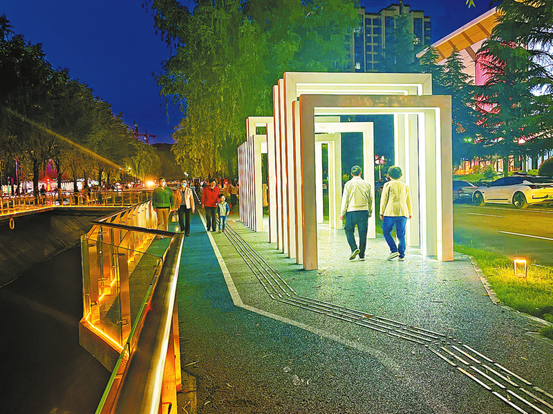 市區(qū)通江路兩側(cè)步道上,游人絡(luò)繹不絕。市民紛紛拿起手機(jī),拍攝黃沙河改造后的美麗夜景。黃沙河沿岸從之前的道路狹窄、坑洼不平,變成如今整潔美觀的平坦步道,造型多樣的景觀燈柱在河水倒映下,為夜景增添了璀璨的現(xiàn)代氣息。