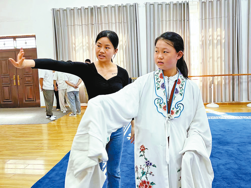 參觀完展區(qū),小記者繼續(xù)前往排練廳,了解戲曲演員幕后的故事。行云流水的水袖、左右晃動(dòng)的帽翅、空中旋轉(zhuǎn)的手帕……11名演員在排練廳內(nèi)給小記者表演了拿手絕活,引來全場喝彩。互動(dòng)環(huán)節(jié)中,小記者踴躍嘗試各種戲曲道具。“水袖要擺動(dòng)起來才好看,兩只手注意擺動(dòng)的方向。”在專業(yè)演員的指導(dǎo)下,一名女生擺動(dòng)起長長的袖子,學(xué)得有模有樣。幾名男生對帽翅很好奇,爭相戴在頭上左右晃搖,大家的學(xué)習(xí)熱情得到了老師的贊賞。