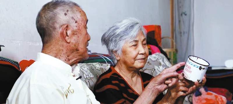 傅根生給老伴講述洋瓷缸的故事(攝于2019年,他的老伴已于2020年3月去世)