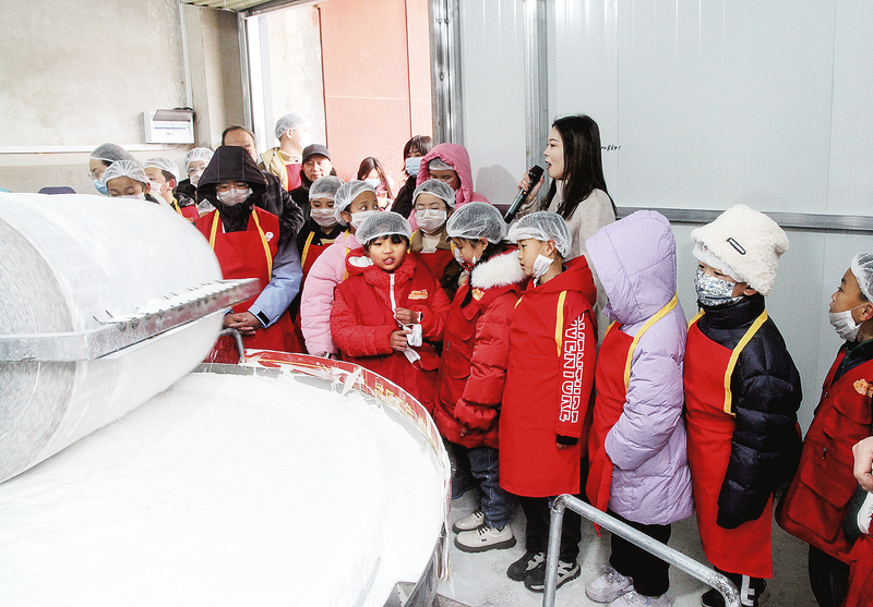 9時(shí)許,糧站師傅帶領(lǐng)小記者們來到古石碾坊觀看元宵制作原材料——糯米粉的制作過程。巨大的石磨不停旋轉(zhuǎn),經(jīng)過5個(gè)多小時(shí)浸泡的糯米被碾碎,看著碾磨糯米粉的復(fù)雜工序,小記者們爭相提問。“糯米在碾碎的過程中需要加水嗎?”小記者邵子笑率先發(fā)問。“經(jīng)過浸泡的糯米不需要加水,只需要將其碾成粉末狀態(tài)就可以。”糧站師傅回答道。還有小記者問:“元宵不是滾出來的嗎?”面對這個(gè)問題,糧站負(fù)責(zé)人侯曉鵬笑著說:“制作元宵的第一個(gè)步驟是準(zhǔn)備好需要的原材料,除了糯米粉,還有餡料,準(zhǔn)備好了以后才可以滾元宵。”