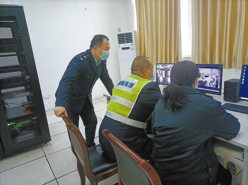 2月15日,腰市收費(fèi)站副站長(zhǎng)陳鑫(左一)正通過監(jiān)控系統(tǒng)認(rèn)真分析站區(qū)車輛通行情況。