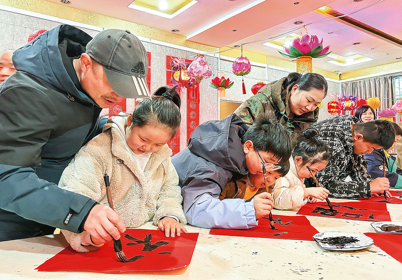 ?、?月21日,在市文化館舉辦的”非遺過大年”活動現(xiàn)場,工作人員和家長指導(dǎo)小朋友寫春聯(lián)。(本報(bào)記者 王 倩 攝)