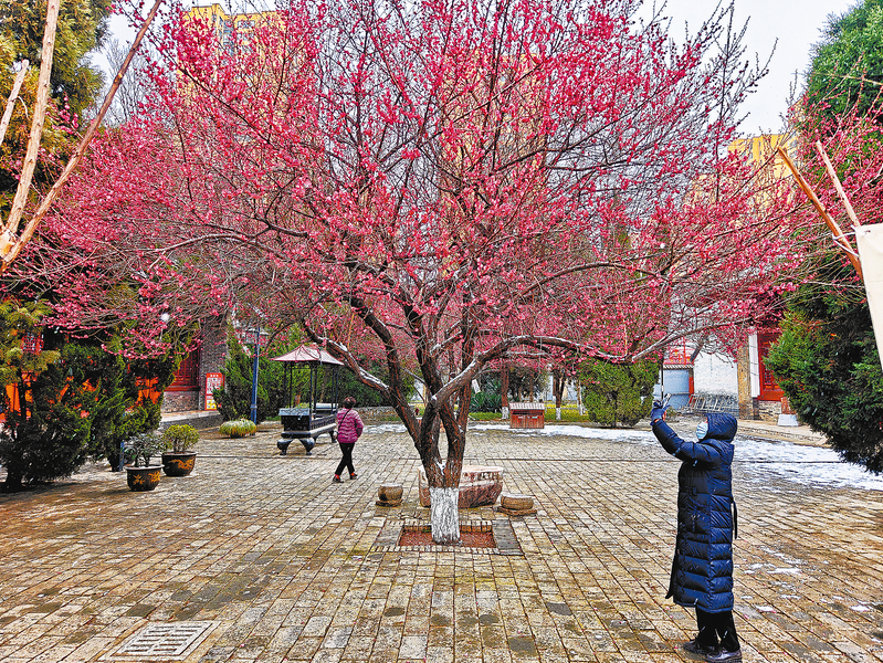 △2月21日,位于商州大云寺內(nèi)的兩樹紅梅迎著風(fēng)雪綻放,格外耀眼,吸引了市民前來觀賞、拍照留念。據(jù)了解,每年的2月下旬至3月初,大云寺內(nèi)的梅花都會(huì)如期盛開,游客可免費(fèi)進(jìn)院觀賞。 (本報(bào)記者 楊 鑫 攝)