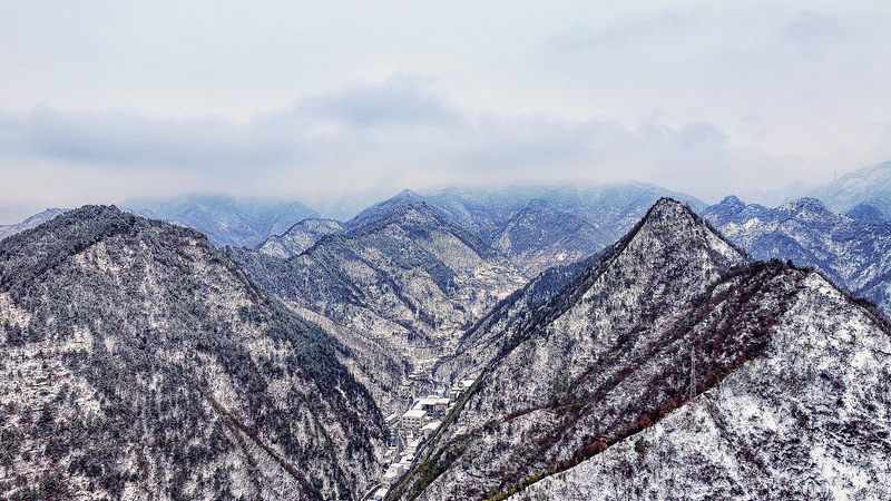 2月23日,俯瞰丹鳳縣界嶺,雪后的盤山公路猶如一條銀蛇蜿蜒而上。 (本報通訊員 郝建勛 攝)