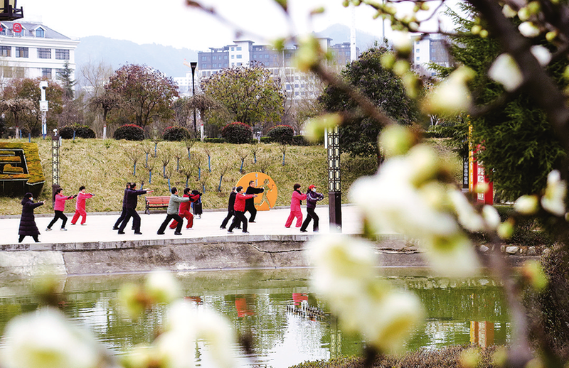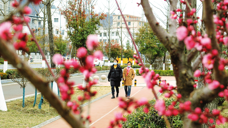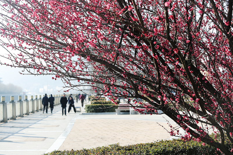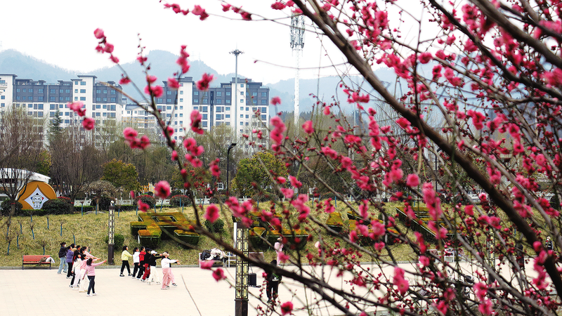 3月4日,鏡頭下,錯落有致的紅梅和正在晨練的市民定格成如詩如畫、朝氣蓬勃的瞬間。