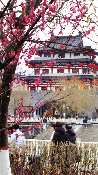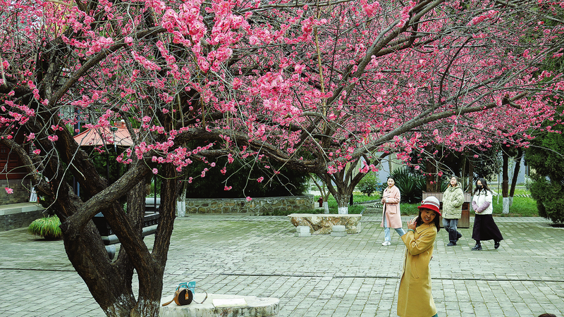 3月4日,游客在大云寺兩株古梅樹下打卡留影。這里是市區(qū)紅梅花開得最早、花期持續(xù)時間最長的景點(diǎn)。