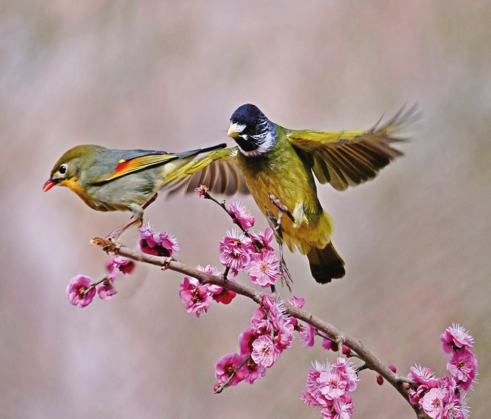 相思鳥(niǎo)(左)和領(lǐng)雀嘴鵯(右)嬉戲在春花盛開(kāi)的枝頭。(本報(bào)通訊員 李 海 攝)